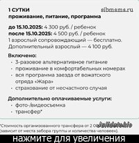 У нас сейчас мощная акция на раннее бронирование выпускных и новогодних заездов) эльза04 Мы были как то осенью, предметов мало, ходить на уроки не заставляют, сильно отстали от школы. Если это началка то ещё норм, а вот 7-9 класс не советую. эльза04 Заезд 20 суток обычно. Обучение скорее формальное не по всем предметам,т.к. дети из разных классов и для всех полноценное обучение конечно нереально... Добрый вечер! Подскажите пожалуйста, у кого дети ездили в лагерь осенью от соц.защиты. Как проходят обучение? И сколько дней заезд? Сегодня позвонили, предложили в октябре лагерь, не спросила сколько дней заезд.