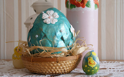 Сделайте вместе с ребенком такой домик для пасхальных сладостей. Только начинать нужно прямо сейчас, ведь папье-маше – техника не быстрая, но очень увлекательная.