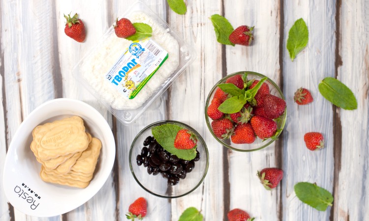 Такое количество ингредиентов рассчитано на разъемную форму диаметром 28 см. Масло выдержать при комнатной температуре, перемешать с измельченным печеньем и равномерно разровнять по дну формы. Творог смешать с пудрой и «пробить» блендером, добавить сливки и растопленный на водяной бане шоколад. Полученную массу выложить на корж и поставить в холодильник на 1-2 часа для застывания. Готовый торт оформить клубникой, мятой, сахарной пудрой и полить растопленным шоколадом.