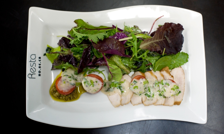 Филе быстро обжарить в соевом соусом с двух сторон, чтобы мясо запеклось, а сок остался внутри. Довести мясо до готовности, добавив воды. Нарезать филе слайсами, добавить томаты-черри, микс салатов и залить заправкой.