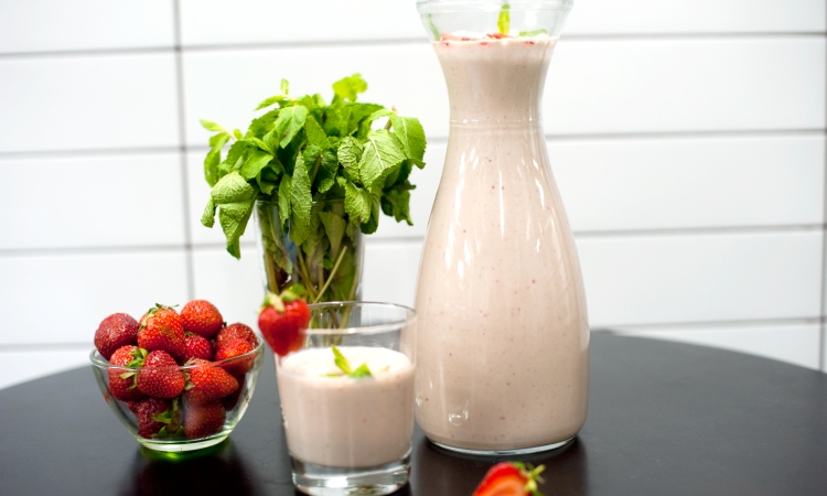 Все смешать в блендере. Украсить свежей мятой и клубникой.