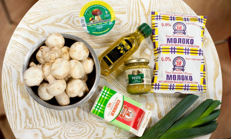 Молоко и сливки довести до кипения и оставить на медленном огне. Добавить плавленый сыр, чтобы суп стал умеренно-густым. Порезанную грудинку, лук-порей и шампиньоны обжарить на оливковом масле, сдобрить черным молотым перцем и добавить в суп. Финальный аккорд - столовая ложка соуса песто. Еще раз доводим суп до кипения, выключаем и оставляем немного потомиться под закрытой крышкой. Готовое блюдо можно украсить свежими листьями базилика.