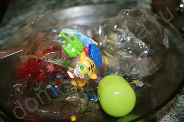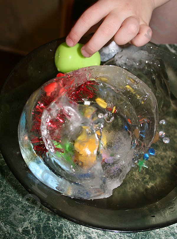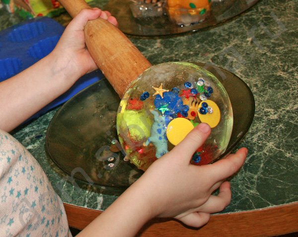 Затем льдина весело разбивается либо деревянным молоточком, либо скалкой, у кого что под рукой. И дети с восторгом собирают "добычу", вылетевшую из шара. Действо захватывающее. Обязательно будем еще делать такой шар.