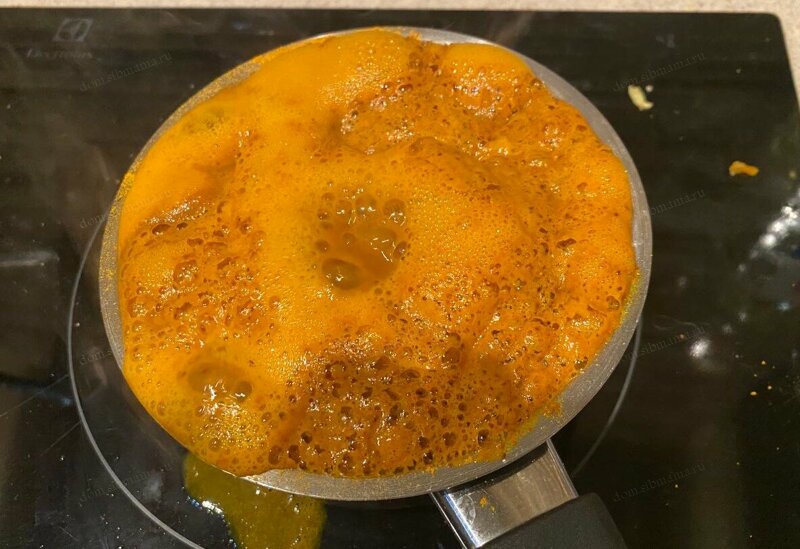 У меня был достаточно большой пакетик старой куркумы, привезенной откуда-то года три-четыре назад. Мы его весь и высыпали, и это получилось слишком много, у нас уже была не жидкость, а кашица. Можно брать намного меньше, конечно. Серый – каркаде