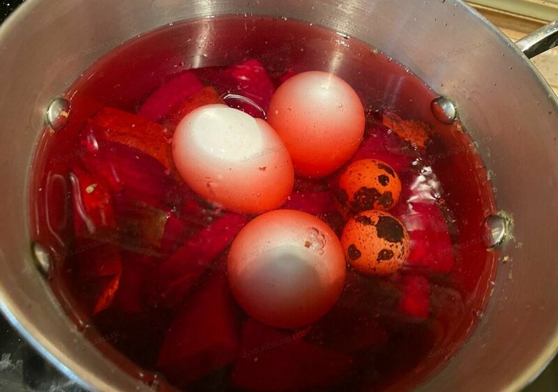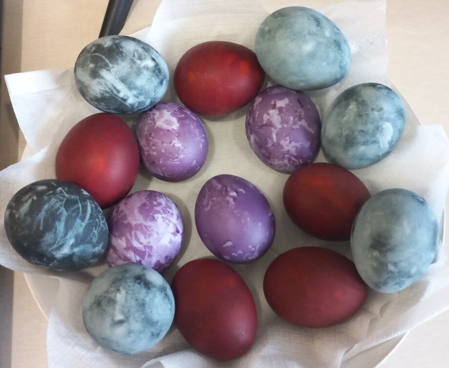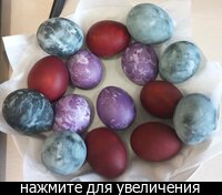 краски из магазина у меня вызывают эстетическое отвращение Красили много чем разным, но я поняла, что больше всего люблю классический цвет после луковой шелухи, вот такое что то из детства, пусть и будет всегда в семье. Но буквально сегодня привезли в подарок из Тайланда анчан (синий чай), хочу попробовать в этом году. А со свеклой видела как красили. Вареную не чищенной свеклу, чистят, трут на терке, отжимают сок. В этот сок погружают промытые пищевой содой, варенные и остуженные яйца. Погрузить, подержать, высушить(можно феном), потом опять погрузить. Цвет получился от розового до бордового, зависит от свеклы и количества погружений в сок. Чем свекла темнее и слаще, тем лучше цвет.